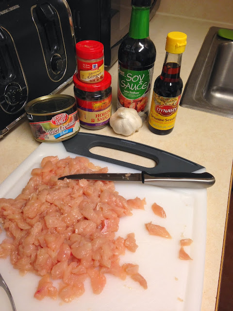 3. while chicken is cooking, cut onion, garlic, peanuts, and water chestnuts